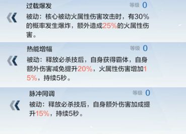 先从库洛亲闺女脉冲说起吧。作为火队的必备角色,脉冲本体拥有两个减火抗技能(QTE和核心被动),六星武器有一个减火抗技能(概率减抗),一个装甲型传统技能(降低目标额外伤害减免)。火队可以没烬然(火子哥代替……手动狗头保命),没苏菲亚,但是绝对不能没有脉冲!(吹得有点狠了……但确实很猛)下个版本,脉冲得到空前的加强,所以,养了绝对不亏。且随着目前大家各个队伍的成型情况,战区的输出模式逐渐由单角色战场转变为双c对刷或主c副c模式,那么更要求每个工具人都有相应的等级跟练度。玛莎大佬最新的视频表示,烬然,脉冲,苏菲亚的火队,还是超级强的。但是,大佬的视频嘛,全都是极致玩法了,对于平民月卡党来说,sss以上的脉冲是可望而不可及的。但是,sss以上的脉冲,输出是很恐怖的。我们来看技能介绍: