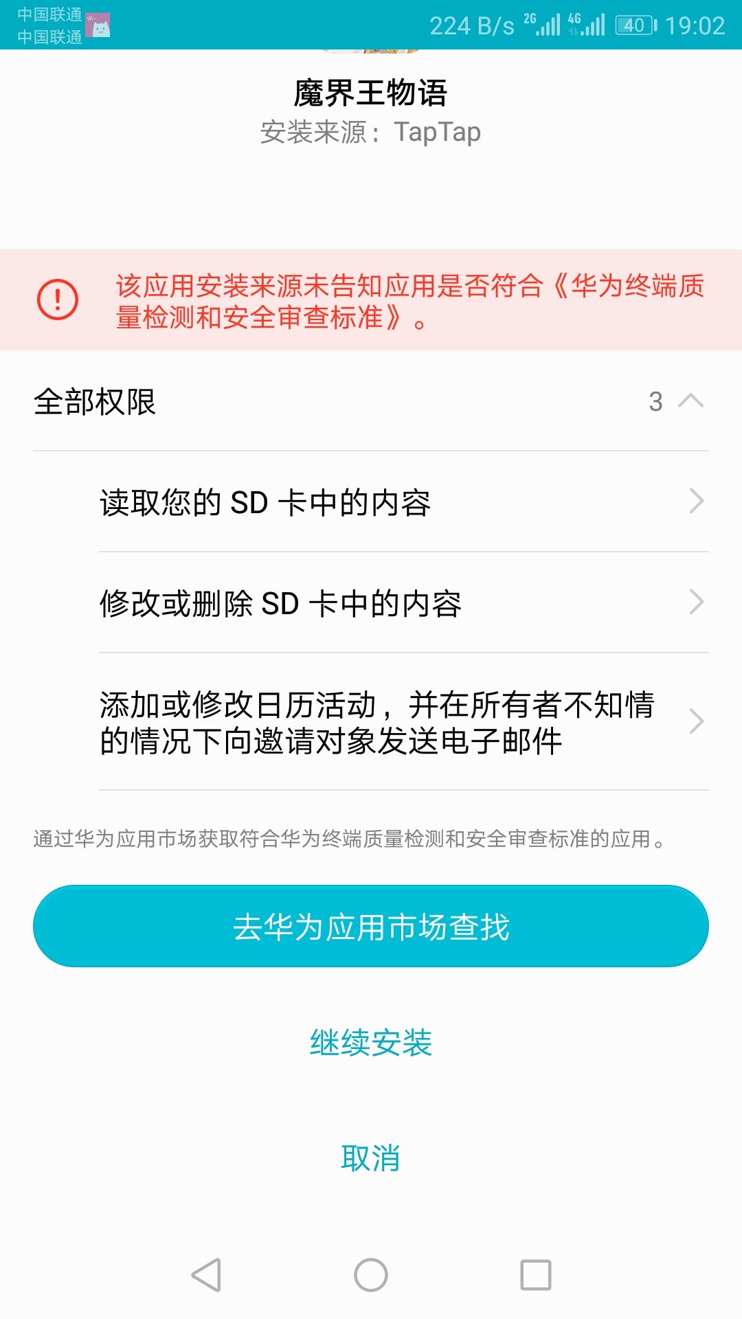 下面这张图是借的。我也是华为手机,当时安装的时候也没想那么多,因为很想玩这个游戏就一路给绿灯,看到有玩家发帖才注意到。