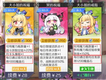 首先说白嫖之友——月卡,首先,由于游戏福利非常好,所以懂的都懂想要长期玩的玩家非常推荐氪一个大小姐的戒指(终身卡),每天上线领工资(1200魔晶石),但凡玩的时间长一点都不会觉得亏,如果还想小氪一下可以再氪一个大小姐的祝福(月卡),每天工资加个倍,还能加速升级,氪了不亏。如果还想氪可以考虑三卡全开,冥的祝福也是很不错的,每天加各种次数,角色养成不掉队。