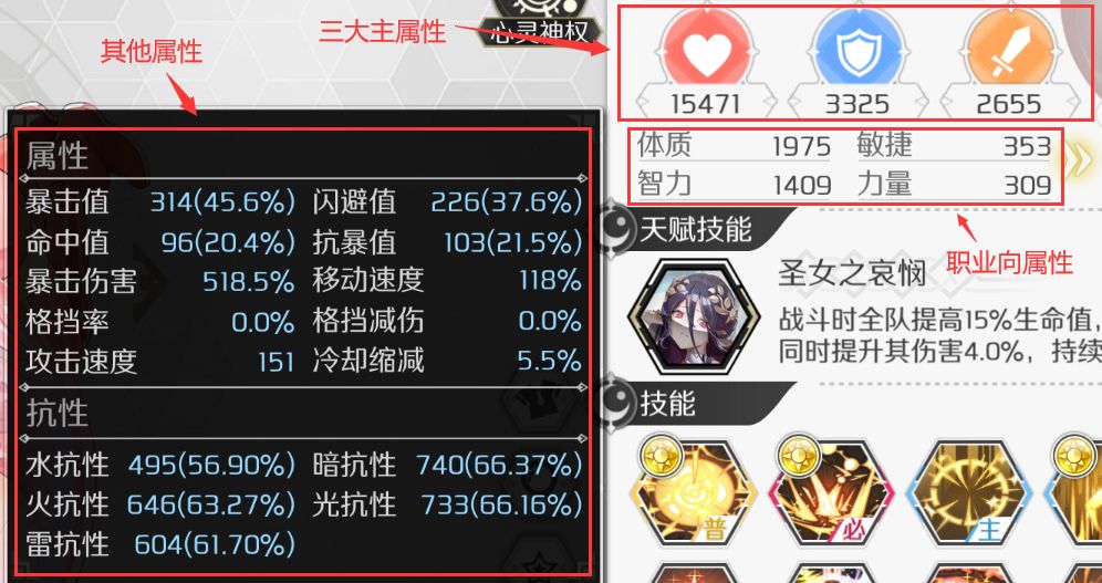 然后是属性。我将属性分为三大主属性、职业向属性和其他属性。