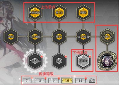 传承,类似点技能,给角色加一些基础属性。需要注意的是上下传承点都需要额外的记忆传承材料,这部分材料的获取来源于星之裂缝,困难难度通关获取上传承点材料,噩梦难度通关获取下传承点材料。双数传承等级的最后一个传承点会升级该角色的天赋技能。