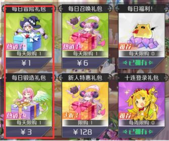 然后是每日礼包,每日礼包推荐买一块钱和三块钱的礼包,初期可以斟酌是否氪一个六块钱的单抽礼包。魔晶石是游戏内非常重要的通货代币,里面的东西也是非常需要的,所以说这些包含魔晶石的礼包是特别划算的。如果有钱,十连登录也可以考虑一下,前期抽卡还是很主要的。