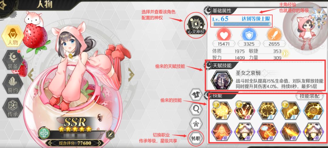 技能则会自带一些,不过大部分的技能仍然是从其他角色身上学来的。技能包含普攻、必杀、主动、被动。必须一提的是,普攻对奶主的改变是很大的,如果普攻带的是治疗型的,那么你的普攻就只会治疗队友,而不是攻击敌人产生伤害。在技能图标的左上角是该技能的属性,可以获得游戏中诸如装备、神权对应的属性加成。