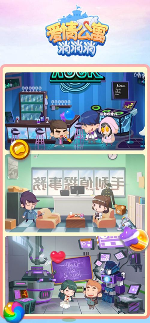 在《爱情公寓消消消》中,各位主角的梦想也都将一一实现,子乔和美嘉终于有了一套属于自己的公寓,曾经离开的小伙伴们也都一一回归,打造自己想要的房间。在公寓里吕子乔开了一间酒吧,各种派对开不停,关谷实现了他当侦探的梦想,开了一家侦探事务所,梦想保卫地球的展博把房间改造成赛朋科技,里面布满了各种仪器、电子屏幕、还有擎天柱和赛博坦!除了这些之外,公寓其他人梦想的房间也将慢慢解锁,快来帮助他们吧!