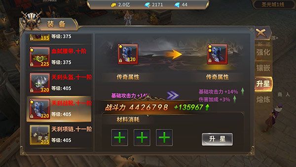 升星加的战力可以说是非常恐怖的,小编攒了一个月才400W+战力,升星一件装备就给我加了13.5W战力,而且代价也很低,新版本更新后大幅度调高了红色装备的爆率,很容易就能爆出来。