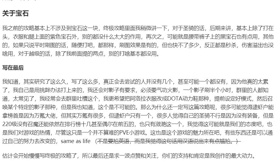 我知道,其实研究了这么久,写了这么多,真正会去尝试的人并没有几个,甚至可能一个都没有,因为他真的太累了,我自己是用挑衅办法打上来的,我还会对影子有要求,必须要气功火影,一个影子刷半个小时,群里的人都知道,太常见了,我经常会去群里吐槽这个,我更希望把阿洛拉衣服改成DOTA动力鞋那种,提前设定好模式,然后召唤某个特定的影子那种,但是我也知道,这个是不可能的。那么为什么还一定写这篇攻略呢,很多人可能觉得逮虾户能拿榜首是因为万氪大佬,但其实万氪有很多,但逮虾户只有一个,很多人觉得自己的圣骑不行是因为没有装备,但是220级没有召魔还能依然在排行榜十几甚至偶尔在前五的,也只有潋滟这一个,我觉得这可能就是我们的态度吧,也是我们对游戏的热情,也是游戏竞技精神的一种体现,尽管这只是一个并不算难的PVE小游戏。但这也是这个游戏的魅力所在吧,有些东西还是可以通过自己的努力去改变的,the same as life (不是要尬英语,而是我觉得这句话用汉语说出来有点尴尬。)