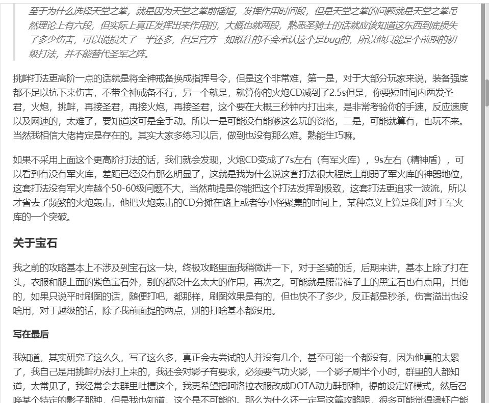 至于为什么选择天堂之拳,就是因为天堂之拳前摇短,发挥作用时间段,但是天堂之拳的问题就是天堂之拳虽然理论上有六段,但实际上真正发挥出来作用的,大概也就两段,熟悉圣骑士的话就应该知道这东西到底损失了多少伤害,可以说损失了一半还多,但是官方一如既往的不会承认这个是bug的,所以他只能是个前期的初级打法,并不能替代圣军之阵。挑衅打法更高阶一点的话就是将全神戒备换成指挥号令,但是这个非常难,第一是,对于大部分玩家来说,装备强度都不足以抗下来伤害,不带全神戒备不行,另一个就是,就算你的火炮CD减到了2.5s但是,你要短时间内两发圣君,火炮,挑衅,再接圣君,再接火炮,再接圣君,这个要在大概三秒钟内打出来,是非常考验你的手速,反应速度以及网速的,太难了,要知道这可是全手动。所以一是可能没有能够这么玩的资格,二是,可能就算有,也玩不来。当然我相信大佬肯定是存在的。其实大家多练习以后,做到也没有那么难。熟能生巧嘛。