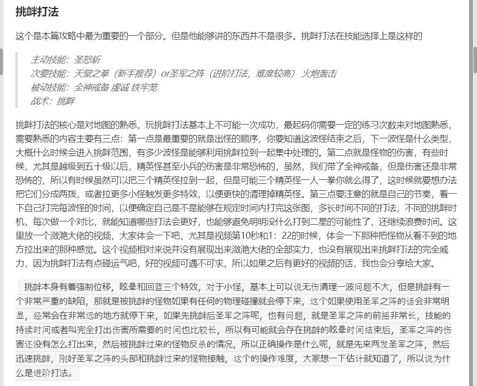 截至目前,五区圣教军已经有两位大佬通关了,我个人223级也到了沙漠地图,所以我们今天就来谈一下,圣骑士的后期养成和越级方法。并且本篇攻略结合潋滟大佬的一些建议,以及我自己和其他朋友的实践,我们开发出了另一套更加适合于没有军火库的圣骑士的越级方法——挑衅打法,能够让我们用自己的技术和肝度弥补自己装备的不足。`