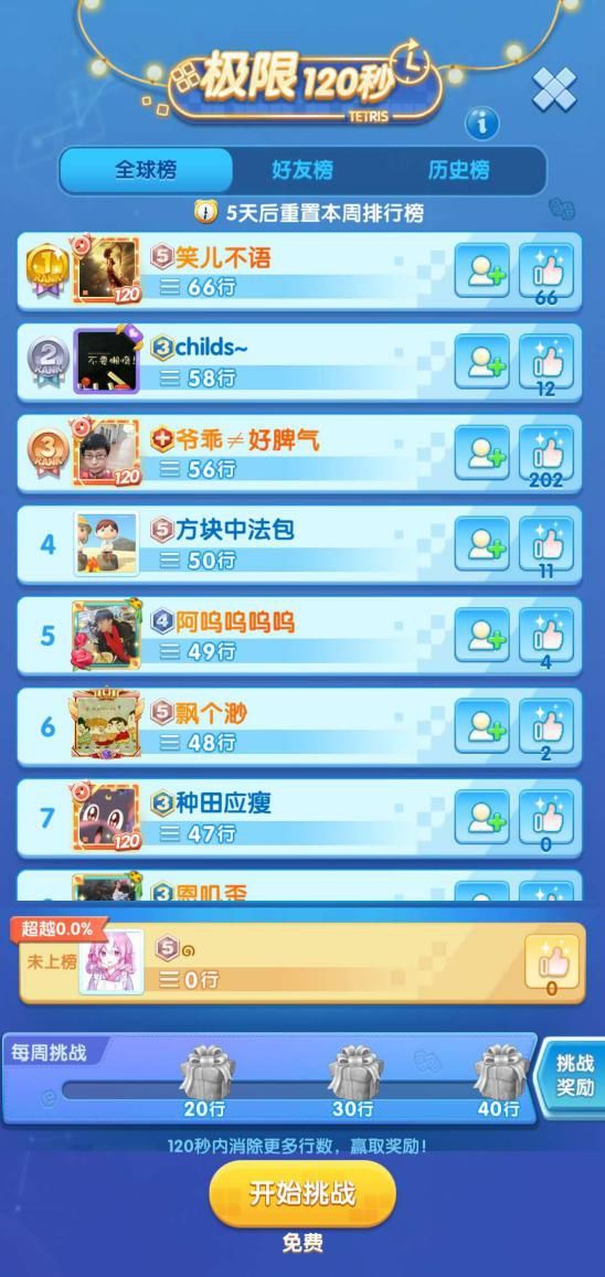 七块儿面对极限120秒,总是不能畅所欲言,时间真是太短了,但高手们又一次为七块儿带来了新的惊喜。在微信服务器榜单中,第一名的“笑而不语”,他累积消行66行;第二名是“childs~”消行58行,努力下还是蛮有希望超越第一名的呢;第三名“爷乖=好脾气”消行50行,与后续玩家并没有太大距离,也许不努力的话就会被超越。