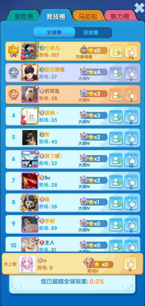 在《俄罗斯方块环游记》里,竞技玩法足以彰显玩家综合实力,每个高手都七块儿学习的榜样。在本次微信服务器排行榜第一名的是“七块儿”,胜利高达107场,获得方块传奇段位,这是与我同名吗,为什么同名不同命?第二名的“狐击霸放”以胜利37场,获得4星大师IV段位,与第一名差距不小,足够冠以“庆幸”二字;而第三名的“折耳兔”以胜场38,成功晋级3星大师IV段位,萌萌的名字相信会成为吸粉的存在哦。综合该榜单来看,只要获得2星并胜利30场,那么均有望入驻前15了哦!
