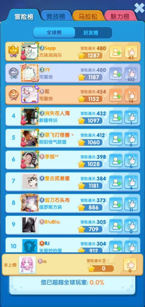 赏更美的风景,看最精彩的比赛,是七块儿在方块世界最伟大的理想,冒险玩法就是挚爱之一。在微信服务器冒险榜中,第一高手的“Sepp”闯关480关获得总星数1287,成绩在榜单中很是扎眼,属于满满的实力派;第二的“YY”成功闯关480关获得总星数1187,萌化的名字成为大家印象最深的闯关高手;而第三高手的“延”成功闯关454关获得总星数1152,关卡数量虽不是最多,但星数潜力巨大,有望成为冠军潜力股。如果你能耐住寂寞专心挑战自己方块摆放极限,那么下次可以来尝试一下冲榜!