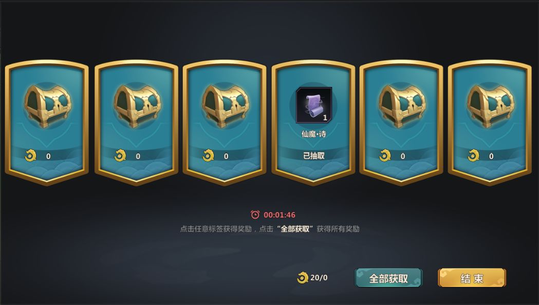 3.巧遇运财星君:和发现宝箱类似,每次会随机6个奖励供你抽取,前面两次免费抽取,两次之后就要花费一定的神源进行抽取了,土豪可以选择全包~