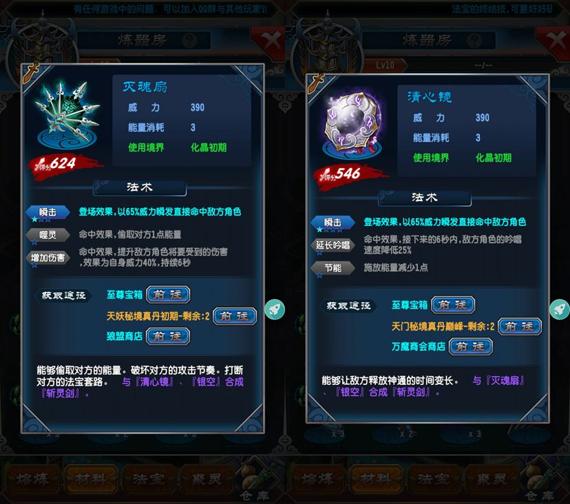 法宝介绍:灭魂扇:噬灵,瞬击,增伤 ;清心镜:瞬击,延长吟唱,节能;银空:瞬击,破甲,节能