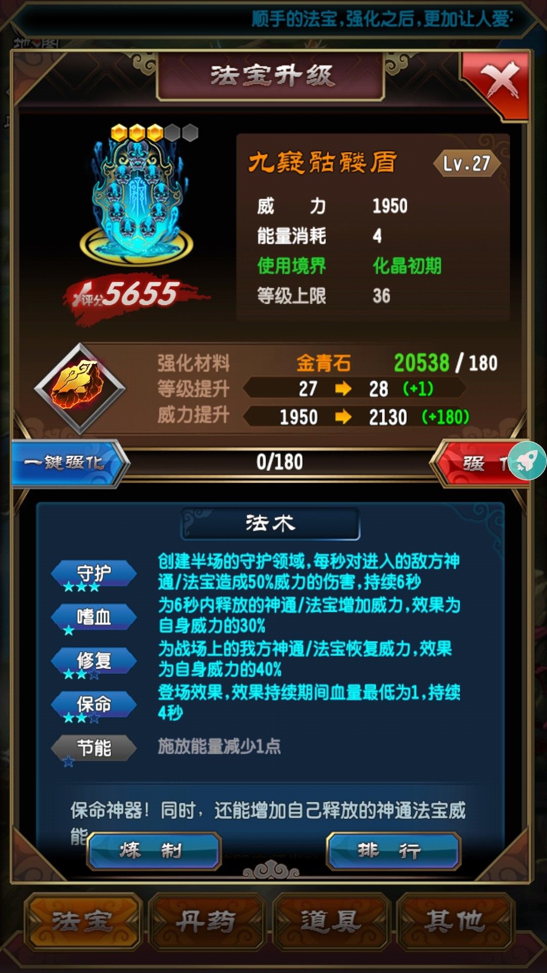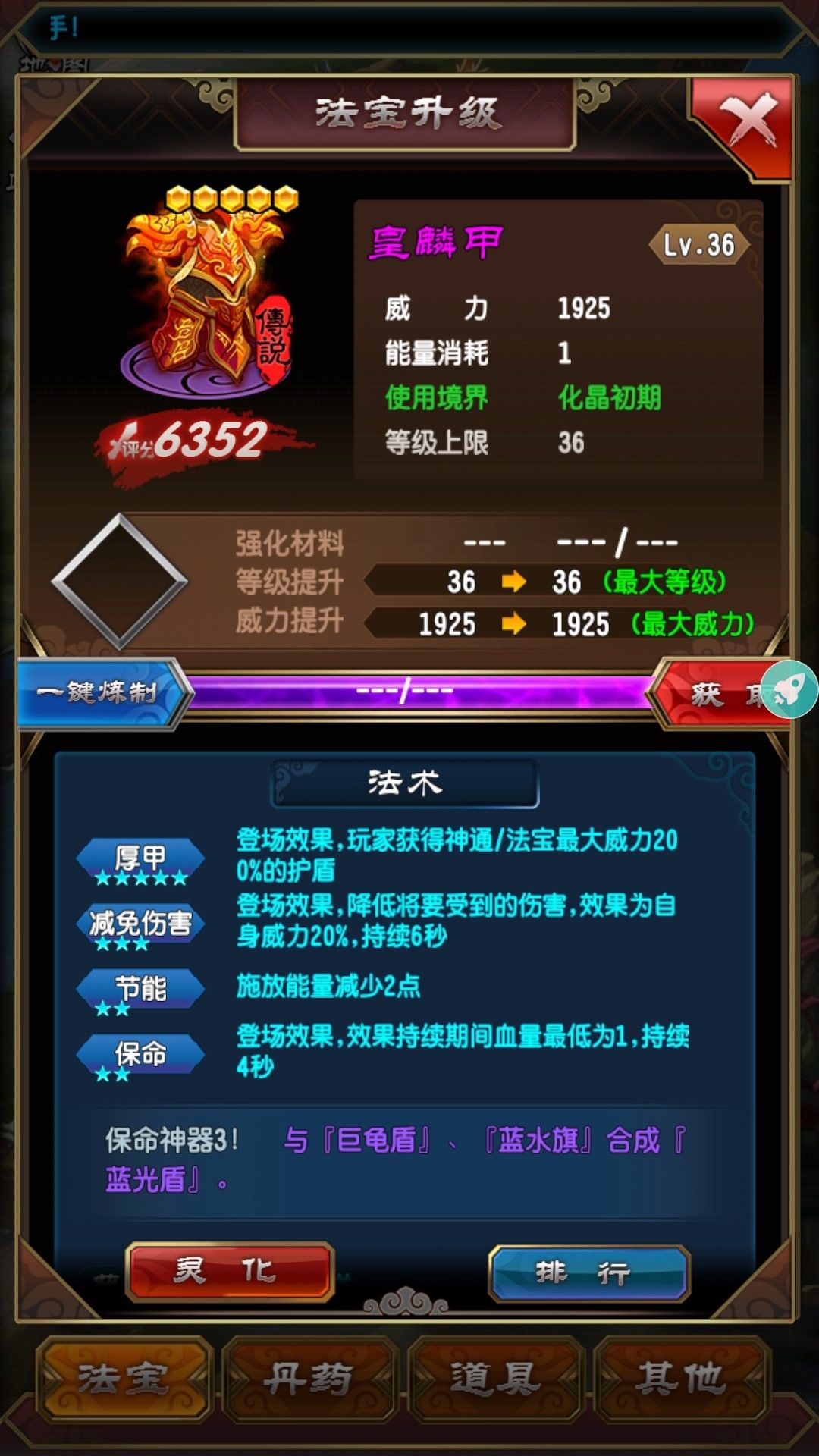 法宝点评:化晶期最重要的法宝之一,是八部血龙功的逆境之王,单次增伤的减免神器。其中二星节能是这件法宝最大的出彩之处。一点的释放能量使得这件法宝在众多时段里都能够游刃有余。