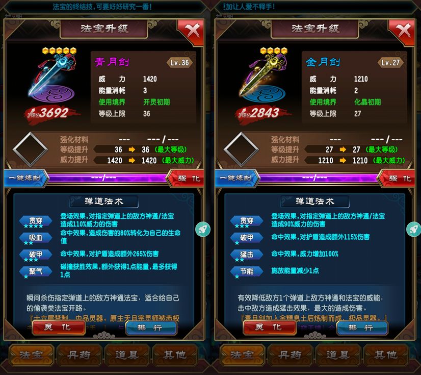 2.冰璃剑,罗羽刀 点评:前者最硬法宝,后者回旋法宝,搭配震荡法宝或是消灭对方震荡法宝有奇效。