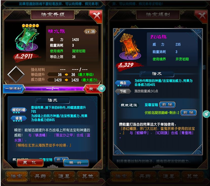 法宝介绍:精水旗:缩短吟唱,修复 烈焰旗:节能,嗜血