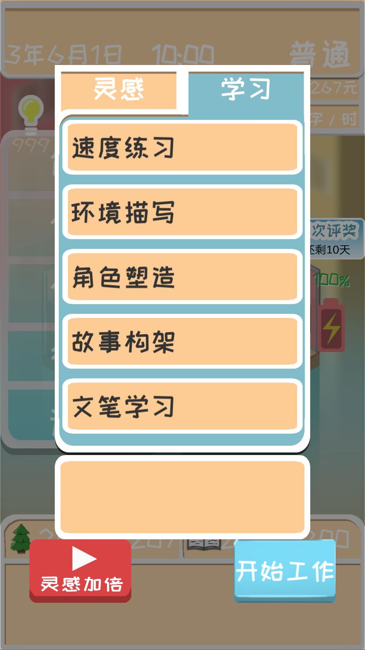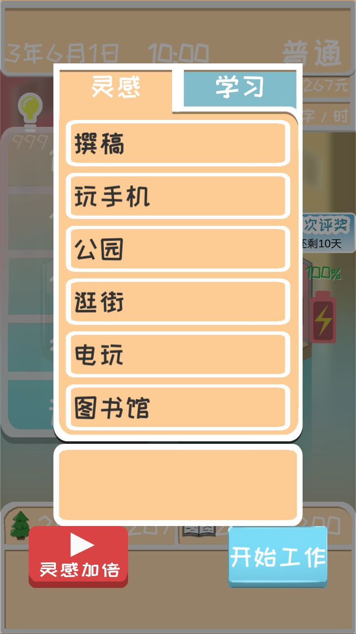 然后开始写书,这时第一个图就很重要了,写书先组合“窜升”,把评分累到10(可能第一本累不到,别花太多时间),然后再“吸量”,电影的时候就“ip”(注意钱来的最快的是电影)。“吸取”也还可以,游戏中期推。写到最后还有坑的话,就用“负责”。