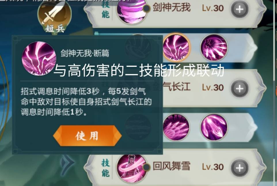 剑神无我:断篇,这个技能主要是用来清兵线,伤害太低,断篇减主力输出剑气长江CD更加实用。如果你的打法偏猥琐一点,也可以选择绝章减敌方移速。
