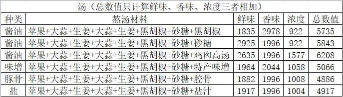 这里不给出各个熬汤材料的数据、熬煮次数关系、连携属性关系,为啥不给呢,因为没必要呀~乱七八糟的那么多不适合大多数玩家,直接给配方来得实在。