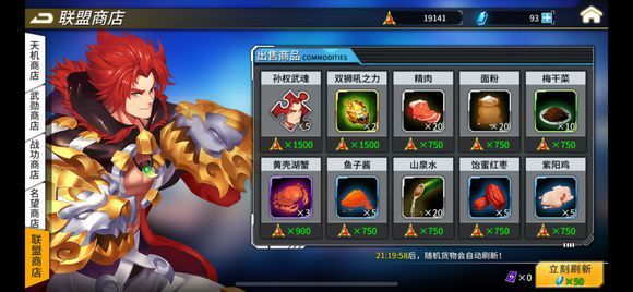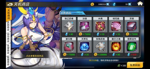 接下来说一下各个商店。 记得能用金币买的绝不用星钻。星钻都要用在主力英雄身上!第一个天机商店,主要就是购买偃月碎片,灵银,和国事无双你自己培养的主要英雄的书,其他没必要购买,10连普通抽魂比这个划算。商店都是24小时刷新制,所以有你需要的就赶紧买了,他的刷新卡一般比较少,每天把自己需要的都买了。武勋商店主要是是诸葛的材料。声望商店是购买吕布的资源,刷新卡会多一些,主要是兵书和相对应的武将兵器碎片,看自己需求,比较建议买兵书。最后一个联盟商店就是培养孙权了,不错的武将,有打断,然后紫色金色的食材有点难搞,见到了可以买一下,并且联盟声望还是蛮多的。