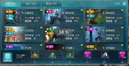 其中活动日历中记录了一周7天中,每天的活动安排时间。其中活动内容当前版本主要包括:杀戮之子、瘟疫之战、海盗船队、古城废墟、云端试炼、哥布林入侵、远古精灵、巡游众神、混沌之龙、遗失之城争夺10种玩法活动。玩家14级且完成指定主线任务之后,即可通过主界活动按钮可打开活动界面。