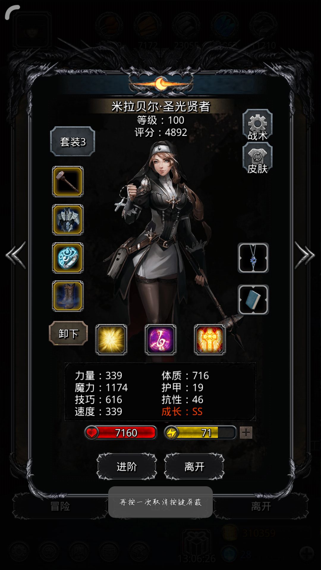 锤子+冬甲+魔力鞋+回复装备(我用了王国戒)+回复战利品(最好有技巧)+先发战利品(没有的话也可以试试,有的话稳一点,图16辛西娅任务会送一个,辛西娅只要凑凑装备单圣骑慢慢耗就行了,到时候直接杀了,不要怜香惜玉鸭)