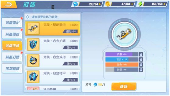 每件装备会带着4条属性,根据装备部位相应的属性会有差异,基本为生命、攻击、防御、暴击、抗暴。玩家可以通过消耗洗练石洗练相应的属性,当洗练出满意的属性,还可以通过祝福石锁定属性,最终洗练出自己想要的属性。