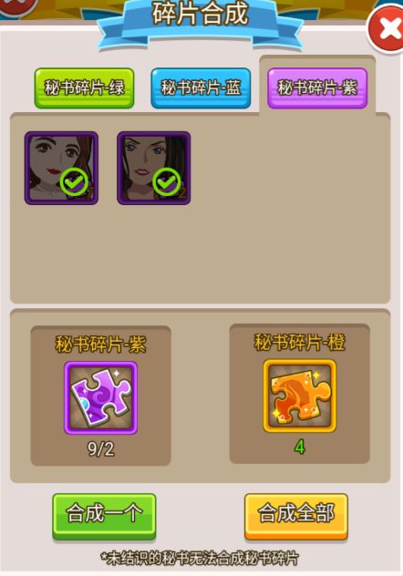 那获得这些碎片只是解锁这些秘书就足够了吗?当然不是!获得的这些碎片当然是拿来合成高级的秘书碎片啦!如果你还没有解锁这些秘书,那么在合成界面上,这些碎片就没办法拿出来用了,未相识的秘书无法合成秘书碎片!