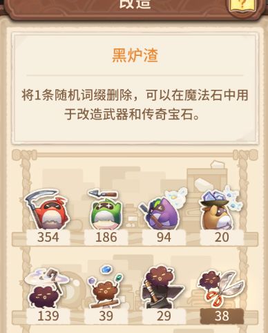 确定了要什么样的属性,我们就要开始做第一步,把现有的词缀删掉。 我这把丧彪有个橙+的普通攻击词缀,按理说是应该用封锁灵和解锁灵配合,留下这一条属性再删掉其他。不过一来大部分情况下是不会刚好有一条橙+的有用词缀的,二来内测封锁灵和解锁灵确实太缺了,所以我们就不考虑这个,直接用剪刀(黑炉渣)全部删掉。