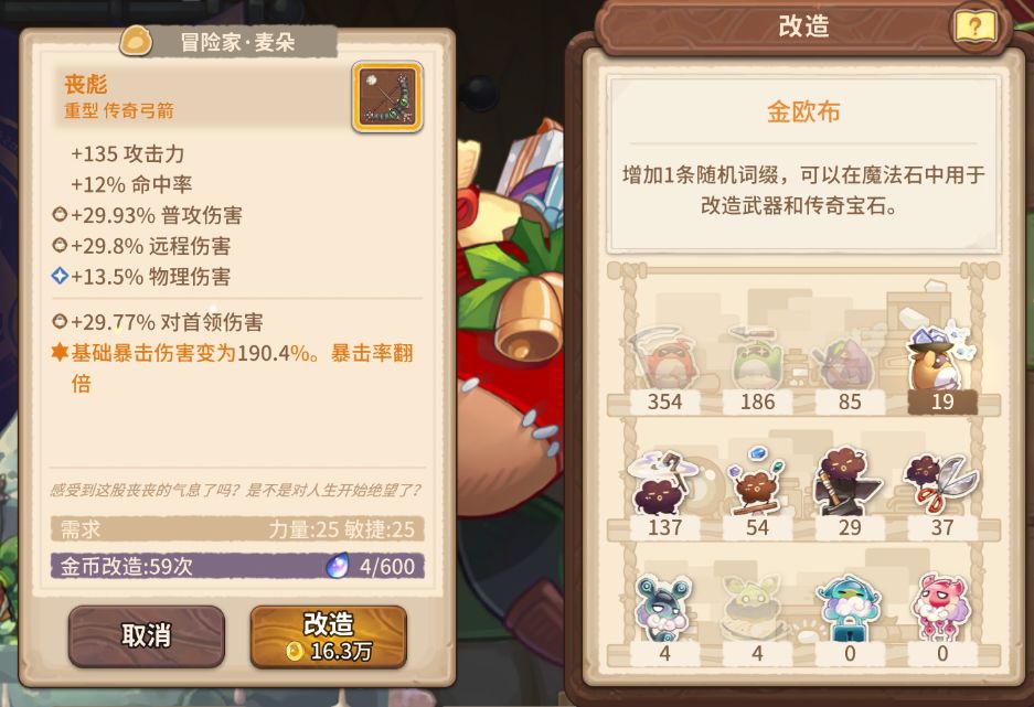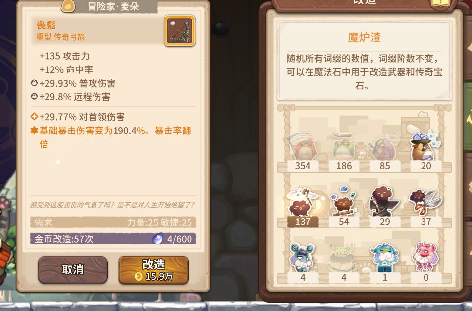 然后再下一步,用魔炉渣(这都是什么破名字)随机这个词缀的数值,我建议是所有词缀都随机到29.5%以上。这个随机只会在等阶内随机,所以不难,这一步我用了9个魔炉渣。