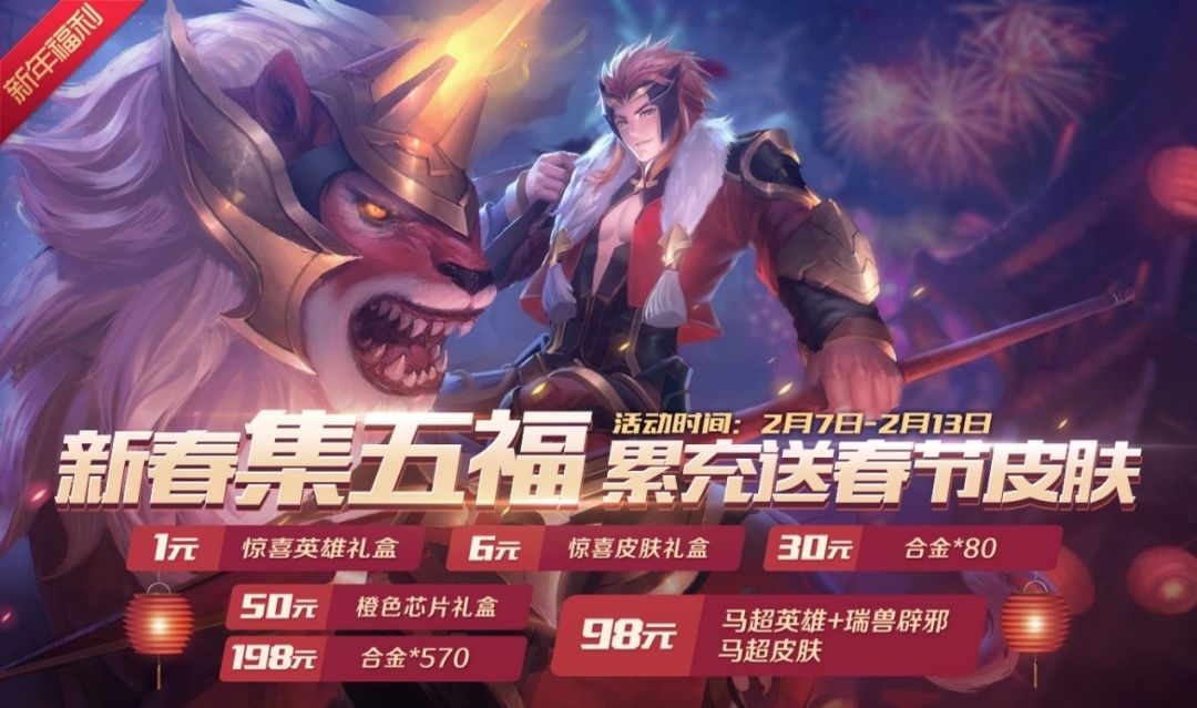 2月7日-2月13日, ,每天指定时间上线,可领取英雄碎片和红包,收集【红包】达到一定数量,即可兑换功夫厨神·胖达皮肤以及量子实验·西蒙皮肤!