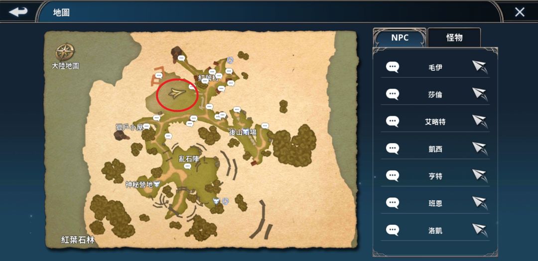 ※点选地图→点选左上大陆地图→选择红叶石林→NPC亨特或红叶村口 【下图红圈处】