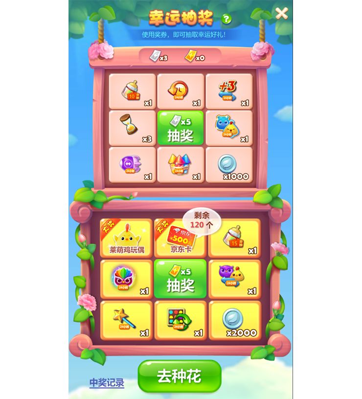 ■ 收获康乃馨获得的奖券可用于抽奖,转盘分为银券转盘与金券转盘。