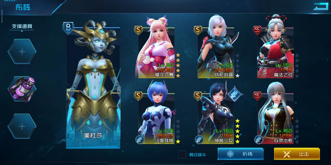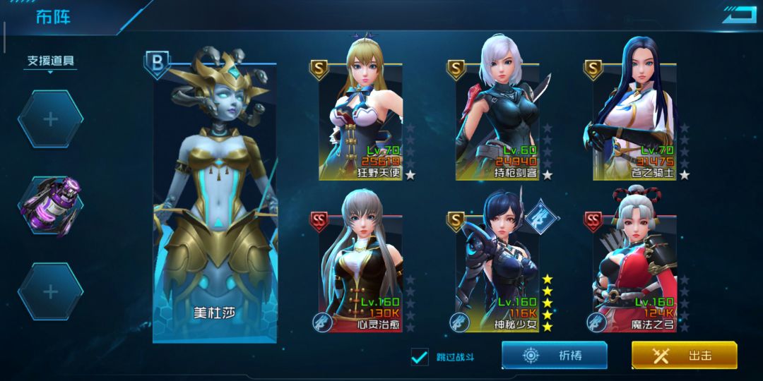 如果你只有两个输出角色等级高,其他的输出角色等级完全跟不上,例如只有女主和持枪是金色,其他的全是银色,而这时你还有元素精灵或者刀剑乱舞也是银色的,就可以选择上阵其中之一来增加主力的输出哦: