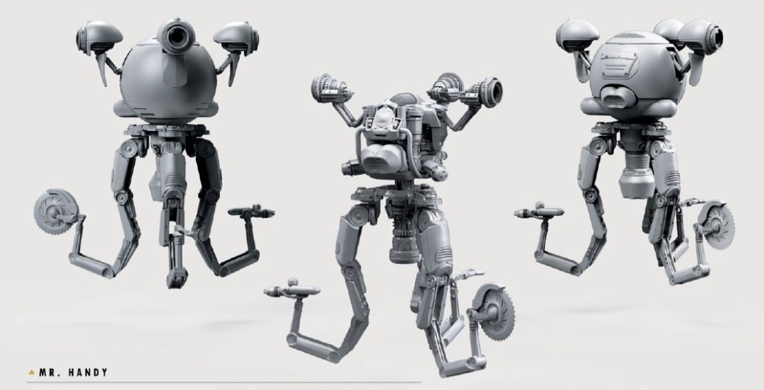 首先登场的是大家的好帮手——“巧手先生”。“巧手先生”系列机器人在游戏设定中,是在战前由国际通用原子能公司发售的建设与维护用机器人。它的外形有些像章鱼,火箭推进力量是普通人类的两倍,精悍的魅力抵得过4只壮汉,这使得它成为当时销量最高的机器人管家品牌,广泛普及于当时一般家庭的生活中。巧手先生的风靡还催生了Godfrey、Wadsworth与Codsworth等各类型号。这些型号以核能驱动,可以自我修复,当不可预测的事故发生时,可以充当最好的人类管家。