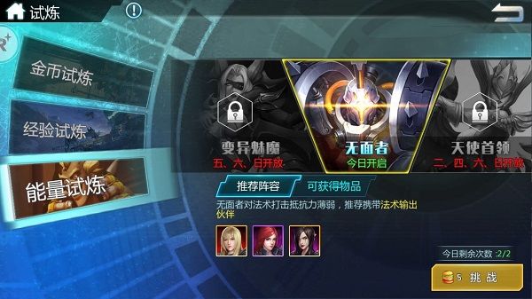 由于能量试炼的boss弱点分别是法术和物理,为了通关效率,建议玩家分别准备法系输出队与物理输出队各一支。对付物理弱点的boss变异魅魔时,建议选用孙悟空开局直接为boss叠满破甲状态提高通关速度。而对付血厚而且攻击间隔明显的boss无面者,建议选用蔷薇或者彦这种有灵活位移的进行游击。