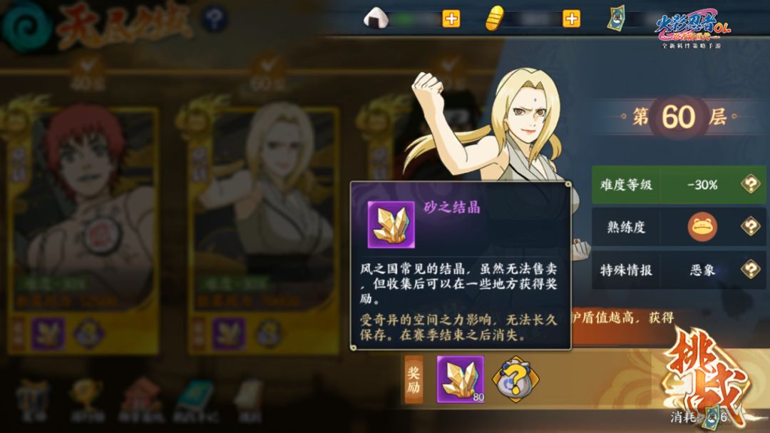 关于历战任务,历战任务目前都是护盾量越高奖励越高,60层最高可以达到40的砂之结晶奖励,需求的护盾目标量经测试大约在2800~3000左右,要肝的同学记得带好风主和我爱罗【疾风传】刷新2次护盾再打死,没有我爱罗【疾风传】的同学可以换次郎坊。