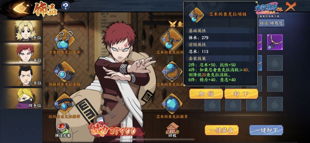 套装效果为大于等于40查克拉消耗的奥义降低20查克拉消耗,针对40蓝以上的忍者基本上是必备套装,属性加成不是很高,但是套装效果很好用。建议准备4套4件,词缀可以随意,更偏向忍、术。