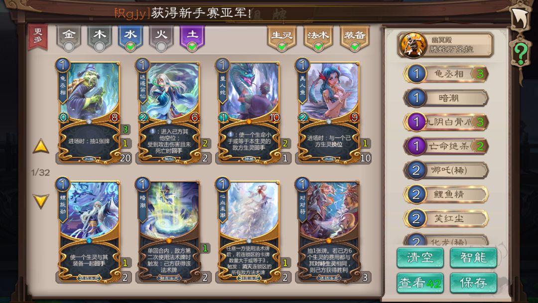 假如我要组一套〖水土卡组〗,进入组卡界面,我们看图,默认五行是为全选。我需要点掉〖金系〗〖木系〗〖火系〗,才能得到〖水+土〗卡牌的展示。如果改为让玩家直接勾选〖水系〗〖土系〗,是不是可以减少一个步骤呢?是不是更符合人的思维逻辑?