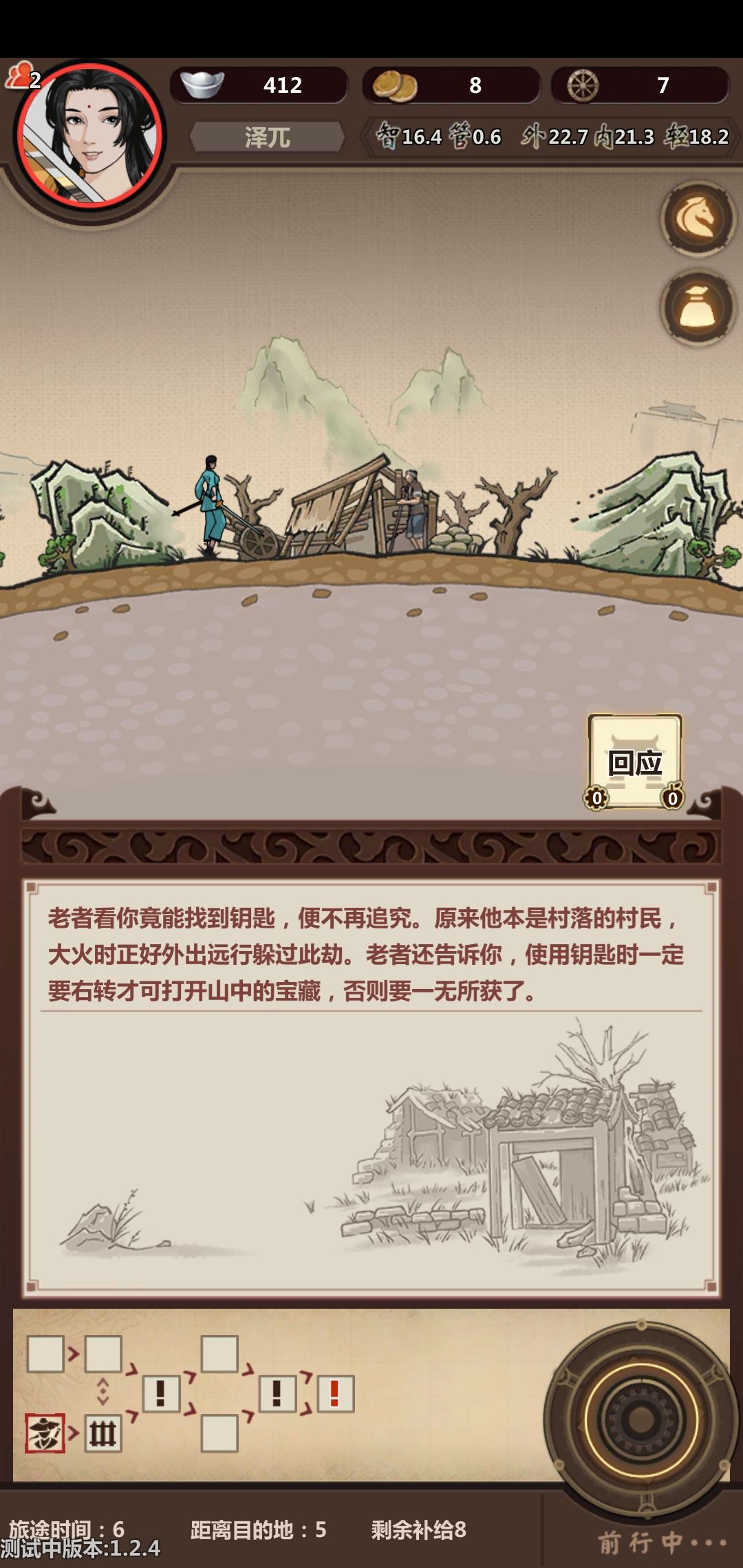走下路会路过一个村子,可选择探索村头村尾。带罗盘后使用罗盘搜索村头村尾得到钥匙和寻宝符,发现一个神秘老人,如实想告后得知钥匙要左转(左转适用于1.23及以前)才可以得到宝物。此事件没触发也可强行用内力把宝箱打开,不过强行打开银***少五十两得到的东西也不一样
