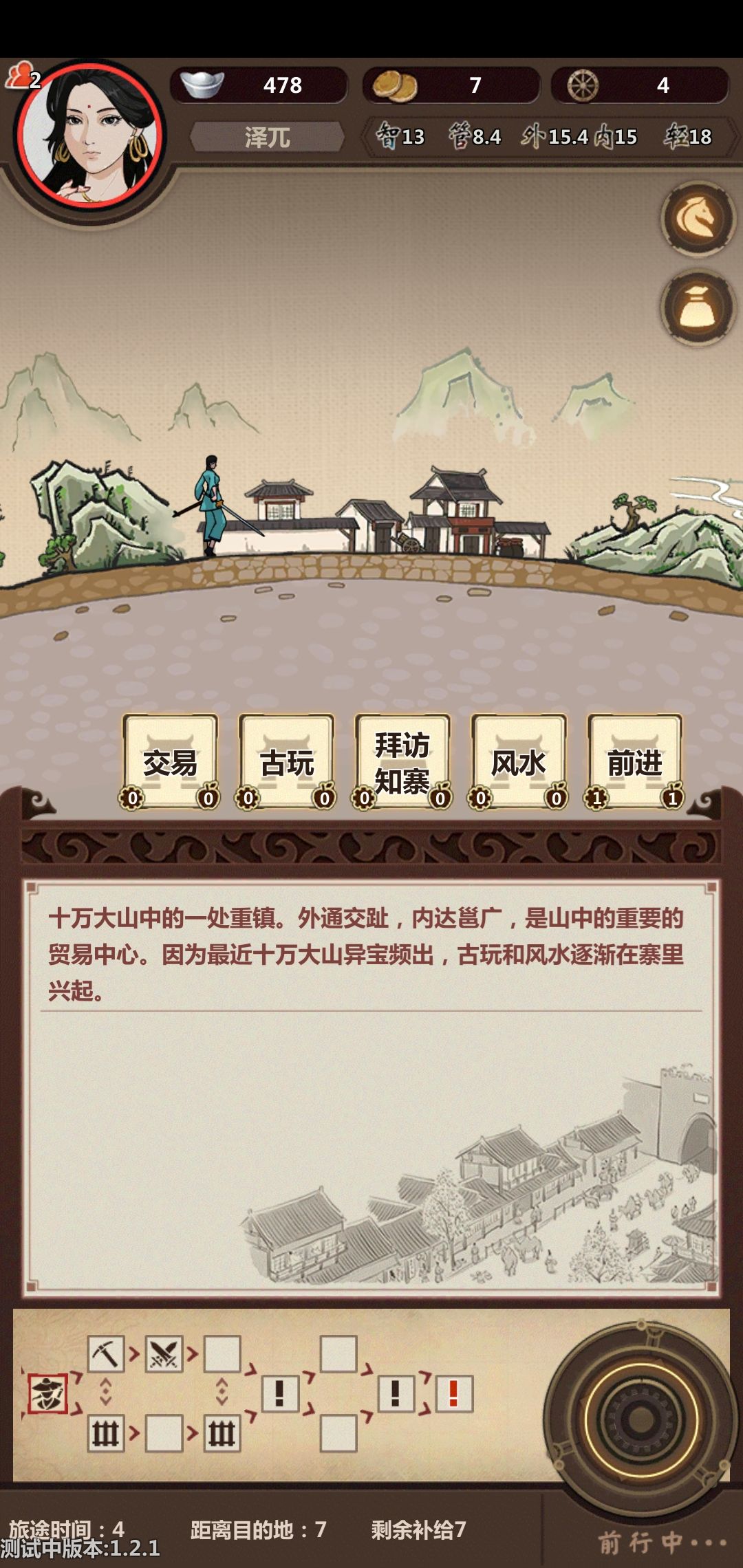 4.十万大山在没得到最终奖励也就是最后那个开宝箱前不会关闭,最后一步时可选暂时不进入,毕竟十万大山路上可以买药什么的,巴戟天人参甘草这些最好刷一下可以做加行动力的药