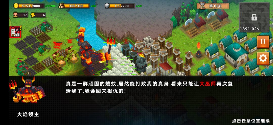 终于过了,这普通难度也太难了,前几次都打不死这boss,最后被人海淹没。这次猥琐发育,造了60个民房才过关了