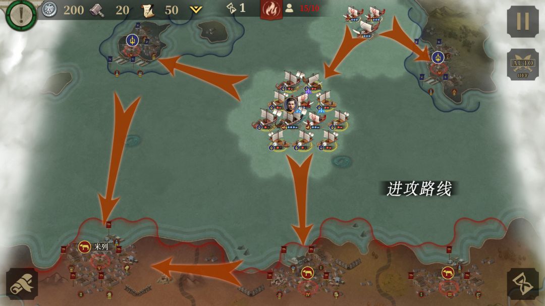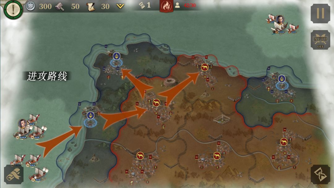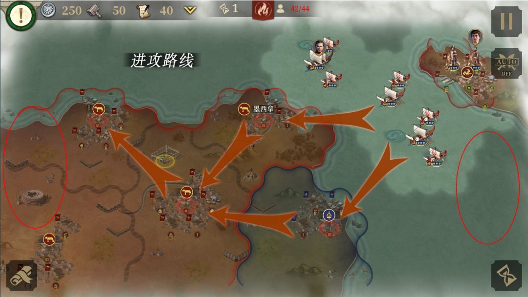 首先是第一关的屋大维线,目标是占领4个关键地区,击败30支敌军,12回合内达成目标。本关5回合后会有援军来帮助我们,条件是4回合内占领墨西拿城和下方的海盗城。占领海盗城会触发地图左边红圈的友方援军;占领墨西拿城会触发地图右边红圈的友方援军。如果你战力不足,4回合只能占一个城,那么推荐先占海盗城。然后按照图示路线向左进攻,占领剩下的关键城。黄圈是3张火炬卷轴。