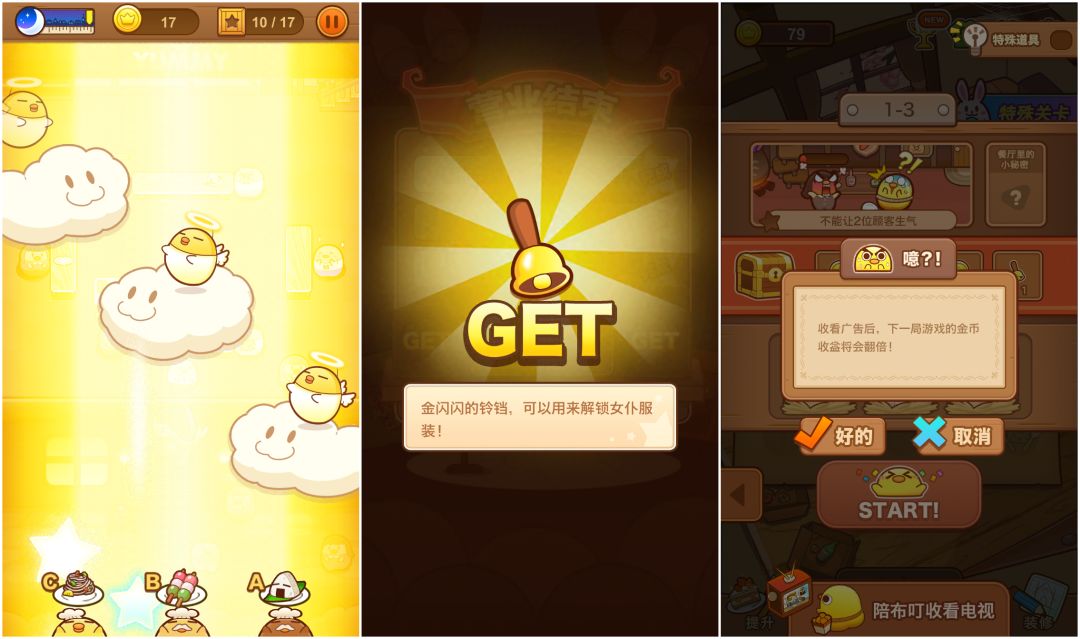 “萌”大概是这个游戏最吸睛最大的亮点和特点了。画面无论是角色设计还是配色,或者细节的背景道具,都显得相当精致萌!游戏的主角是一群可爱的小黄鸡,外观的设计有点像懒蛋蛋酱和鸡小萌的结合。其实是果冻小鸡仔,我们要操纵的就是跑堂的“鸡小二”,为大众鸡顾客点餐、烹饪、送餐。反正我是对这种萌系的生物,是完全没有抵抗力的...