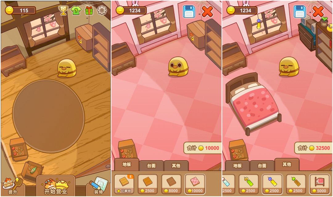 除了收集元素,还有建造也是相当花费金币的!需要慢慢在关卡中赞金币了。但是怎么忍心让这么可爱的小鸡仔睡在破旧的小鸡笼,要把它的房间打造地一样软萌才搭调啊~