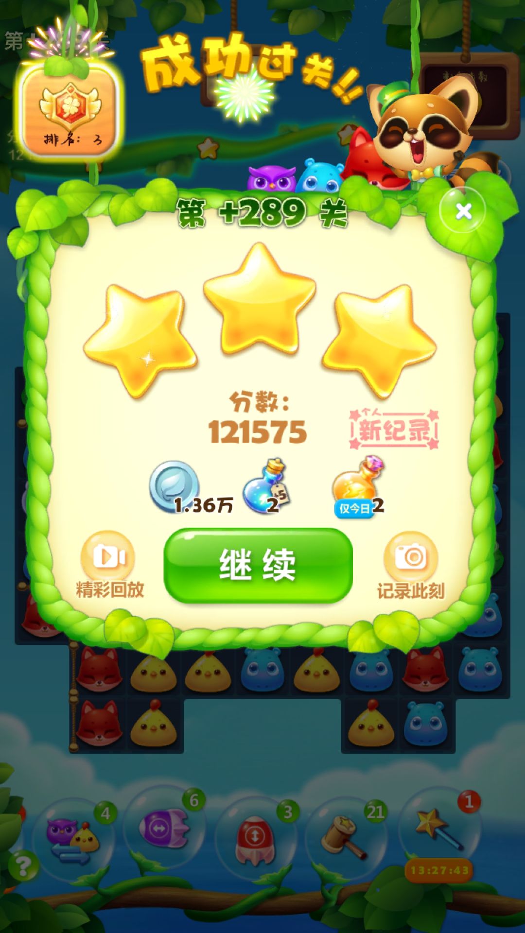 这关固定上边横向特效开局,右下角为开端,往左压制,上边不用管,主打蜜罐,罐子打完,基本上就离过关不远了,一星补三星,打了好久