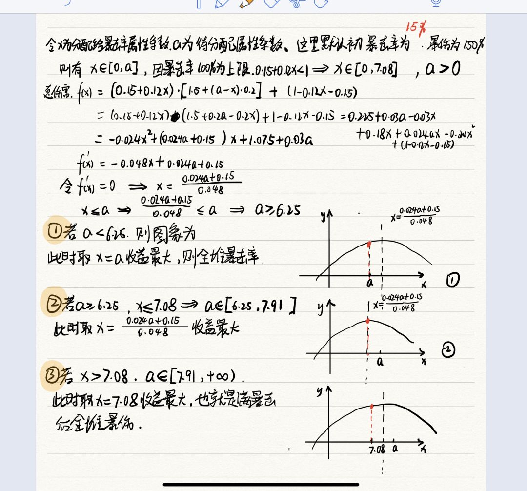 这里我假设的是初始暴击率为15%,如果不为15%会有些许出入,但是大多数情况而言,满暴击后堆爆伤收益最大,最好满暴击!a中间值那种情况特殊,属于资源不够情况下,不是满暴击收益最大。当你分配资源足够,那满暴击是最大化收益。