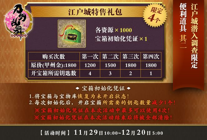 【活动详情】活动期间,江户城特售礼包限量上架。礼包内含各资源*1000、宝箱初始化凭证*1。原价1800甲州金,第一次购买特惠1200甲州金,第二次购买特惠1500甲州金,第三次与第四次购买1800甲州金。宝箱初始化凭证能够将宝箱与宝物库恢复为未开启状态;同时,每次初始化后,开启宝箱所需要的钥匙数量将减少1个!注:宝箱初始化凭证在本次活动中最多可以使用4次;宝箱初始化凭证在本次江户城潜入调查活动结束后将被全部清除。