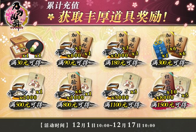 累计充值满800元可额外获得:四资源*3000、御札·富士*1、经验符·中*6;