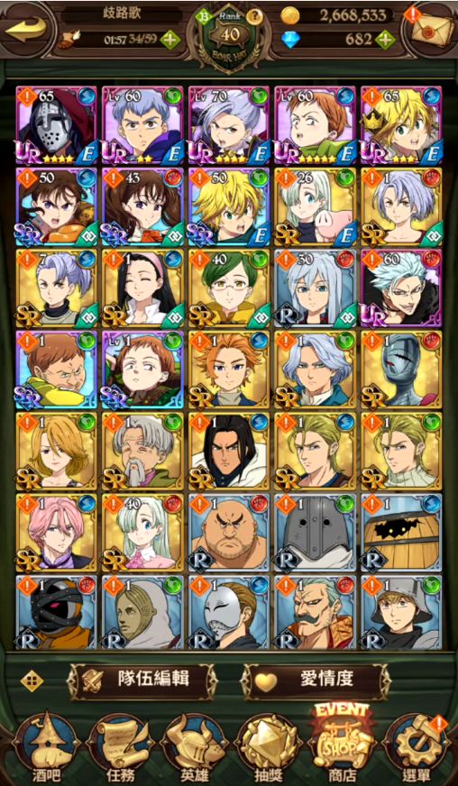 钻石的话抽了2次10连,酒馆买了2个装饰提升歼灭几率的,背包扩充到200,装备130,神速30钻的时装一件,其他都存着,现在的box已经够跟着大佬打歼灭使用,等七罪角色出来后再看情况抽取。